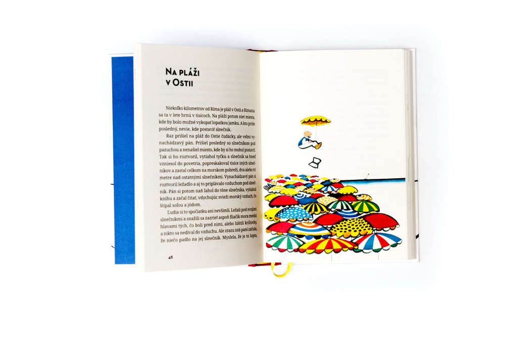 Raz prišiel na pláž do Ostie čudácky, ale veľmi vynachádzavý pán. Prišiel posledný so slnečníkom pod pazuchou a nenašiel miesto, kde by si ho mohol postaviť. Tak si ho roztvoril, vytiahol tyčku a slnečník sa hneď vzniesol do povetria, popreskakoval tisíce iných slnečníkov a zastal celkom na morskom pobreží, dva alebo tri metre nad ostatnými slnečníkmi. Vynachádzavý pán si roztvoril ležadlo a aj to priplávalo vzduchom pod slnečník. Pán si potom naň ľahol do tône slnečníka, vytiahol knihu a začal čítať, vdychujúc svieži morský vzduch, čo štípal soľou a jódom.