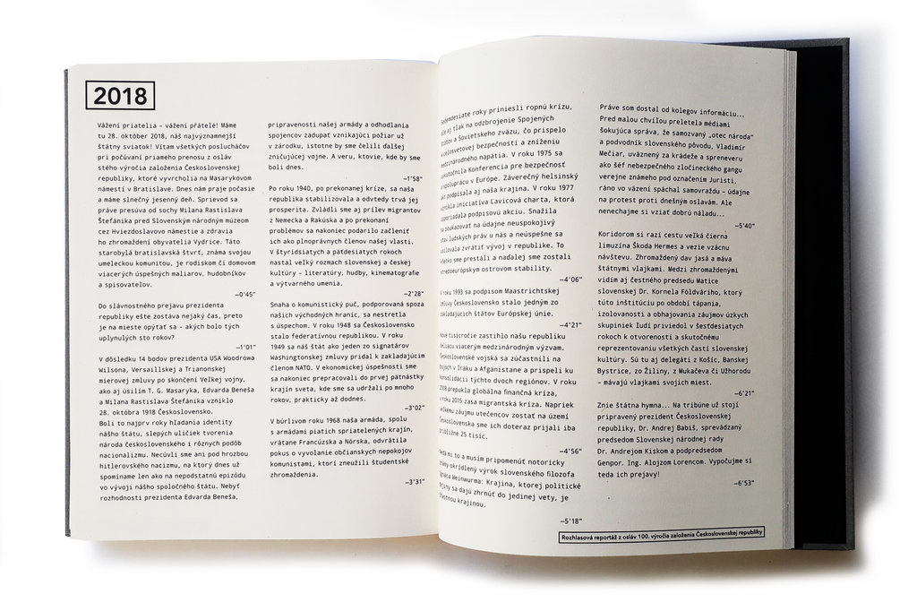 Netradičný vizuálny a grafický koncept knihy vťahuje čitateľa do atmosféry rokov 1914 - 2018. Každému roku je priradený jeden text, ktorý vyjadruje atmosféru danej doby: list, telegram, báseň, správa, nariadenie, rozsudok, rozhovor, zápis v kronike, denníkový záznam... Alebo zaujímavý, zabudnutý pohľad na vtedajší osobný či verejný život. Kniha vznikala voľne popri písaní predošlého Krištúfkovho románu Dom hluchého (finalista Anasoft litera 2013) pri zbieraní historického a dobového materiálu. Je kombináciou dobových dokumentov a autorských textov.